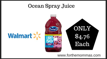 Save on Ocean Spray Juice with this amazing offer at Walmart. It is priced at $5.76 each. And with this Coupon Deal at Walmart on Ocean Spray Juice you can score it for just $4.76 each.
