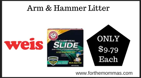 We have a great deal on Arm & Hammer Litter at Weis. It is on sale for $11.79 each. And with this Coupon Deal at Weis on Arm & Hammer Litter you can score it for just $9.79 each.
