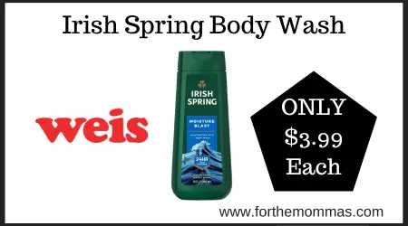Head on over to Weis to get a great deal on Irish Spring Body Wash. It is priced at $4.99 each. And with this coupon Deal at Weis on Irish Spring Body Wash you can score it for just $3.99 each.