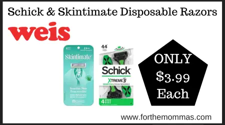 Great deal on Schick & Skintimate Disposable Razors at Weis. It is priced at $6.99 each. And with this Coupon deal at Weis on Schick & Skintimate Disposable Razors you can score it for just $3.99 each.