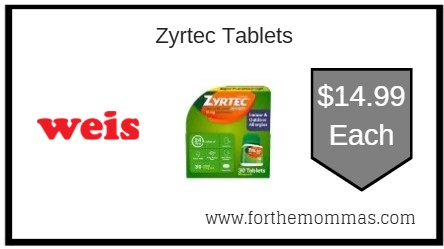 We have a great deal on Zyrtec Tablets at Weis. It is on sale for $19.99 each. And with this Coupon Deal at Weis on Zyrtec Tablets you can score it for just $14.99 each.