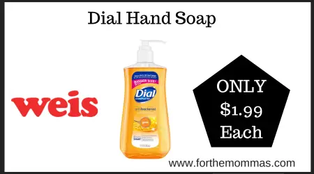We have a great deal on Dial Hand Soap at Weis. It is priced at $2.99 each. And with this Ecoupon Deal at Weis on Dial Hand Soap you can score it for just $1.99 each.