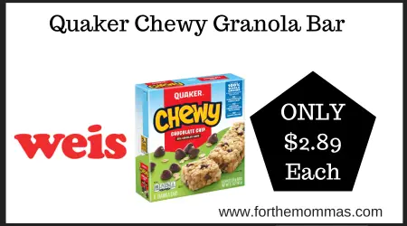 We have a great deal on Quaker Chewy Granola Bar at Weis. It is priced at $3.39 each. And with this Ecoupon Deal at Weis on Quaker Chewy Granola Bar you can score it for just $2.89 each.